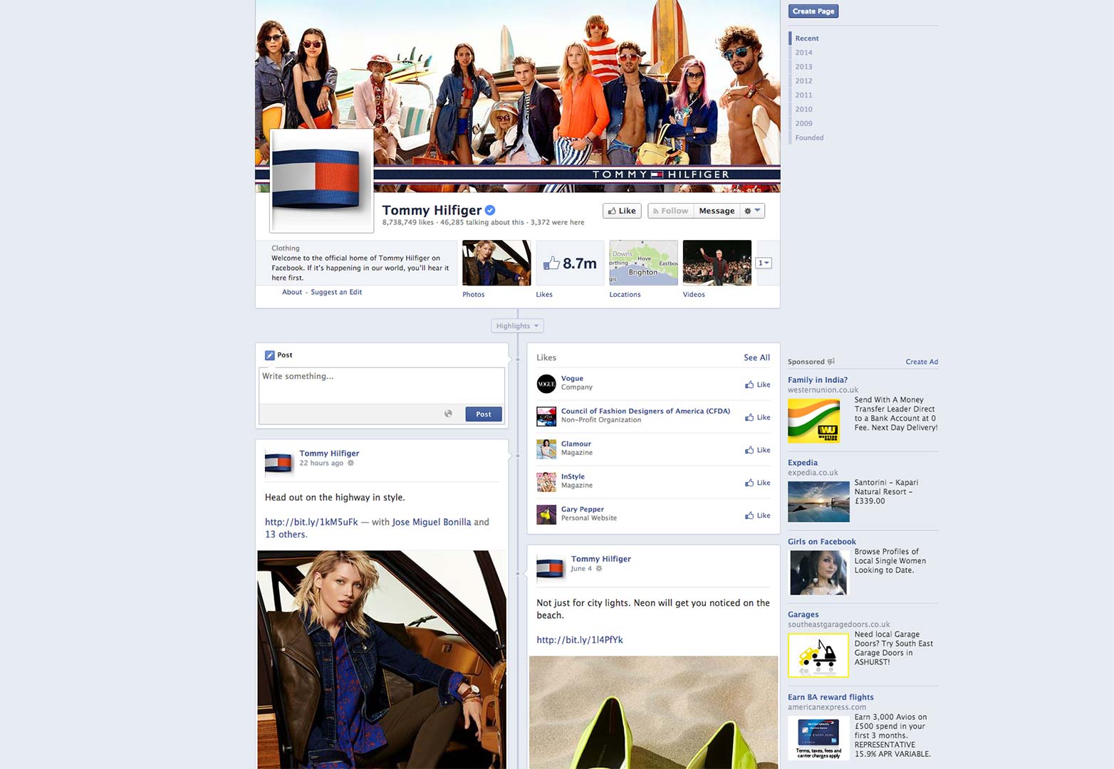 下面以Tommy-Hilfiger的Facebook頁(yè)面為例。這個(gè)美國(guó)潮牌的Facebook頁(yè)面有著870萬(wàn)粉絲,如此眾多的粉絲都是Hilfiger品牌故事的忠實(shí) 聽眾。Hilfiger在頁(yè)面上分享設(shè)計(jì)、名人合作伙伴的照片和新聞以及各種宣傳活動(dòng),圖示通過(guò)圖片、視頻、文字等多種形式傳遞給用戶,引人入勝。