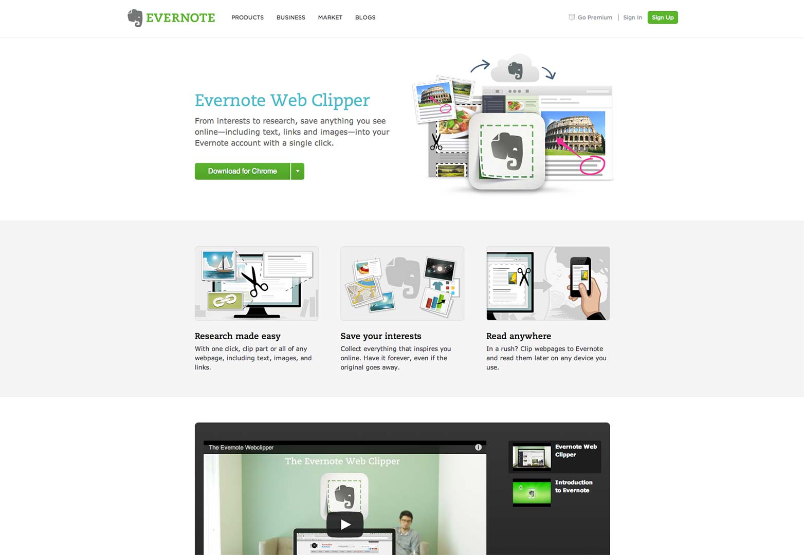 在Evernote Clipper的網(wǎng)頁(yè)中,我們看到了使用了偏向?qū)憣?shí)手法的故事闡述方式。插畫與文字結(jié)合在一起,告訴用戶Web Clipper是如何工作的,看起來(lái)像故事書一樣簡(jiǎn)單直白。