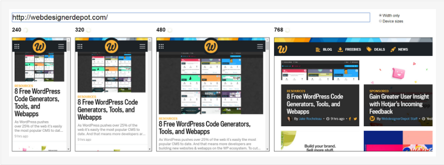 雖然沒有太多裝飾,但是這款工具內(nèi)置了5種固定的寬度用來測試,分別是240px,320px,480px,768px,1024px。