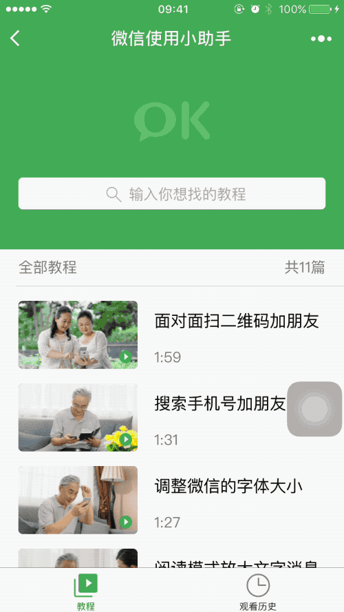 9 月 4 日,微信團隊又推出一個實用的小程序 “微信使用小助手”,通過官方制作的一系列視頻及圖文教程,幫助咱們的父母更好地使用微信。
