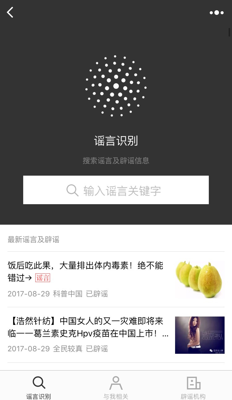 今年 6 月,微信推出過 “微信辟謠助手”。用戶不僅可以主動搜索謠言,如果爸媽閱讀或分享過的文章,一旦被鑒定為謠言,還會收到辟謠提醒。該功能一度被認為能夠作為身邊謠言粉碎機,拯救爸媽的朋友圈。