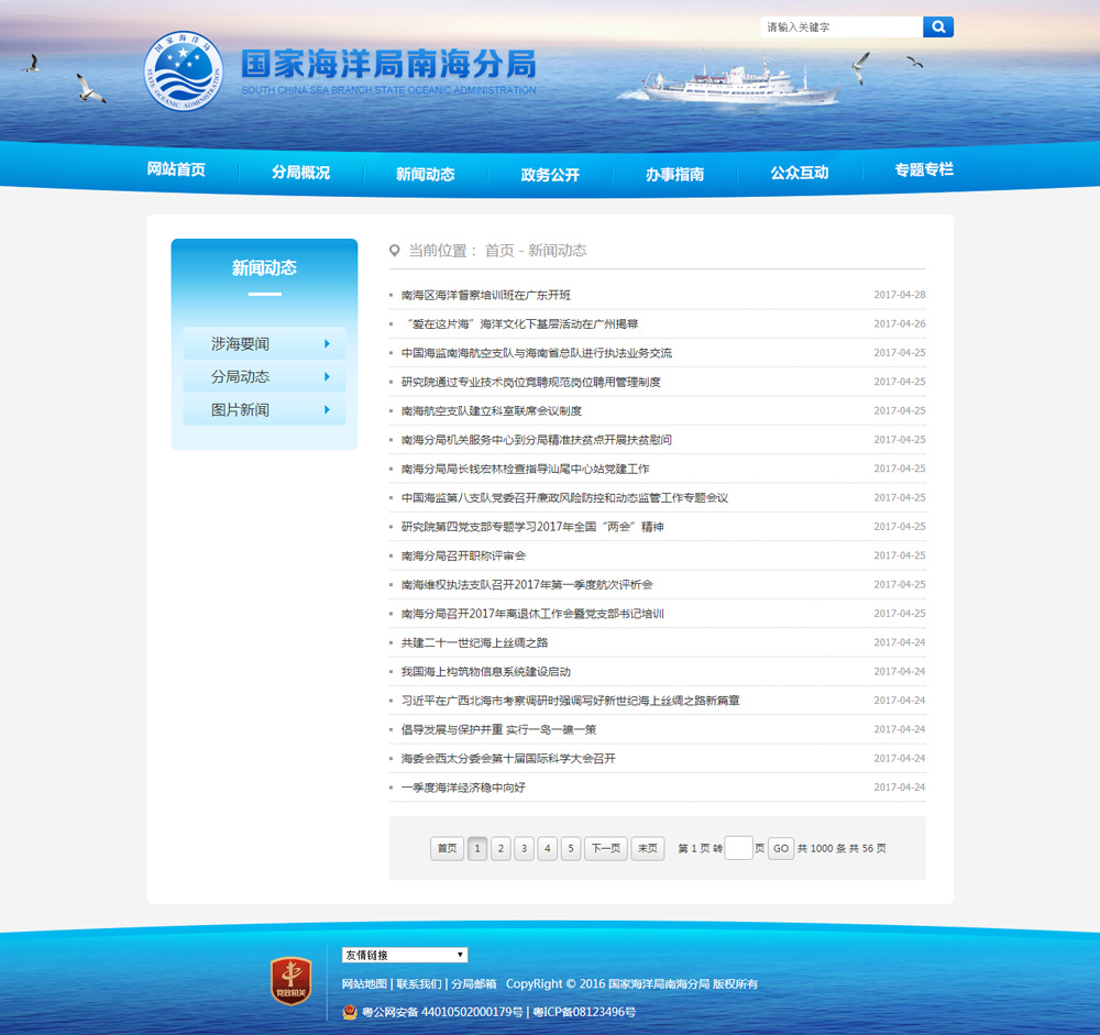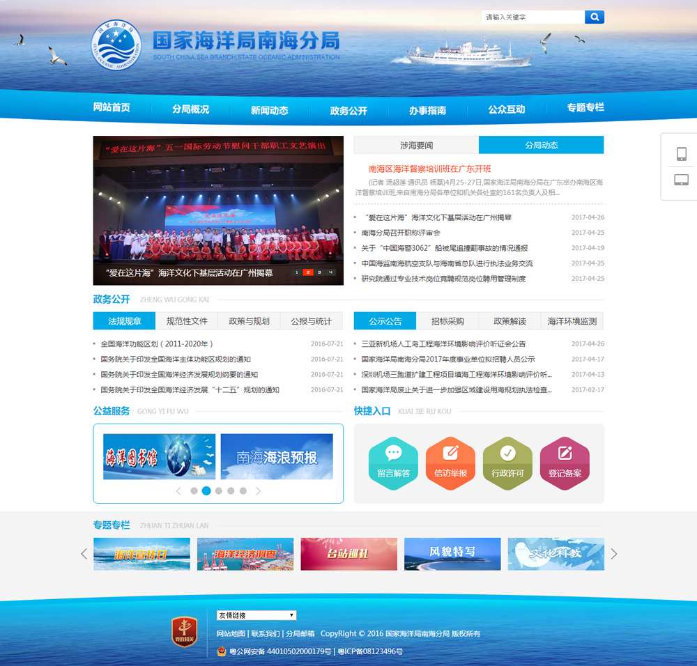國(guó)家海洋南海分局成立于1965年3月18日,是國(guó)家海洋局設(shè)在廣州的南海區(qū)海洋行政管理機(jī)構(gòu)。南海海區(qū)現(xiàn)設(shè)有中國(guó)海監(jiān)南??傟?duì)。分局擁有海洋水文、化學(xué)、地質(zhì)、氣象、生物、遙測(cè)浮標(biāo)、海洋計(jì)量檢定、海洋環(huán)境質(zhì)量評(píng)價(jià)、海洋信息服務(wù)等專業(yè)隊(duì)伍及先進(jìn)的儀器設(shè)備,擁有遍布兩廣沿海的觀測(cè)站網(wǎng)和遙測(cè)海洋環(huán)境數(shù)據(jù)浮標(biāo)網(wǎng)。有裝備比較先進(jìn)的“中國(guó)海監(jiān)”船、遠(yuǎn)洋考察船。